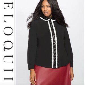 ELOQUII Studio Black and White Ruffle Sequin Tuxedo Button-Down TOP