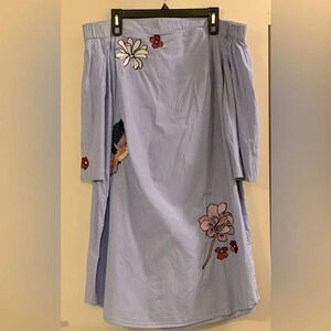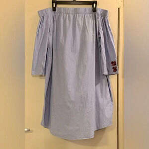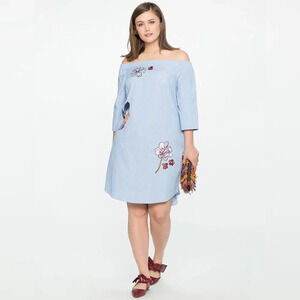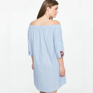 ELOQUII Studio Embroidered Off the Shoulder Dress in Pinstripe