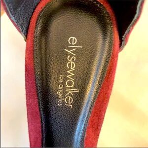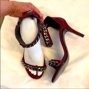 ELSEWALKER SUEDE CHAIN SANDALS. NEW. 3.5 INCH HEELS. BEAUTIFULLY PADDED FOOTBED FOR COMFORT. TRUE TO SIZE. REGULAR PRICE IS $675. COLOR IS NOT RED BUT A BURGUNDY WINE COLOR