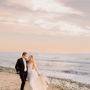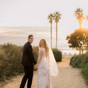Her plunging neckline, illusion tulle sides and stunning train add a subtle touch of drama that contrasts flawlessly against her classic, fitted skirt silhouette.