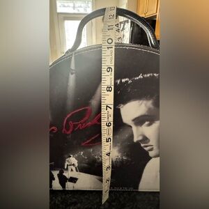 Makeup case featuring an iconic Elvis Presley design. Perfect for fans, this black and white bag has a mirror, space for brushes, and large compartments for your makeup.