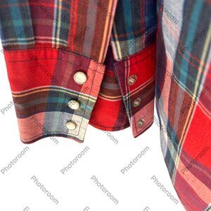 This ELY Cattleman Large snap button long sleeve shirt features a bold and classic plaid pattern in rich reds and blues. With a versatile look and fit, it could easily be styled as unisex. The pearlized snaps down the front and on the cuffs add a traditional Western touch, with the snaps positioned on the left side of the placket—a detail worth noting.
