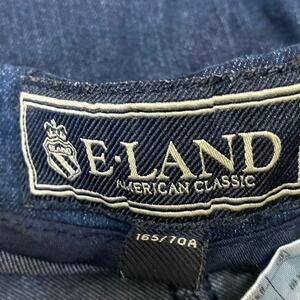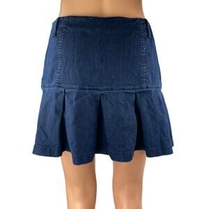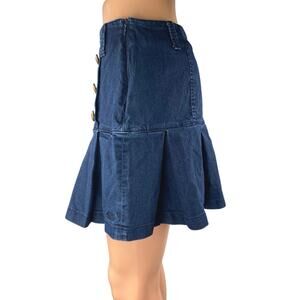 E-Land Blue Gold Button Flare Pleated Side Zip A Line Denim Jean Skirt Size S