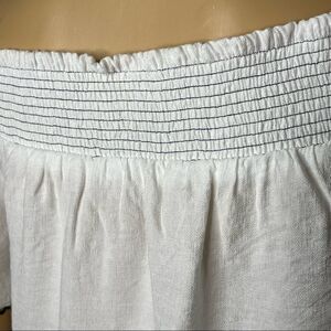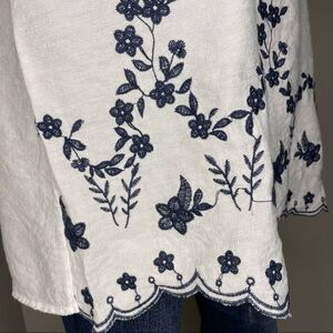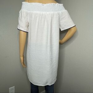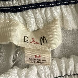 E&M Blue and White Off Shoulder Blouse Embroidered Detail on Bottom Hem Size Medium