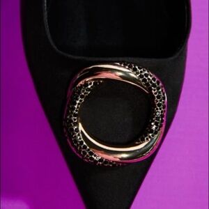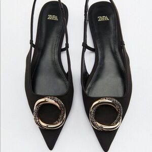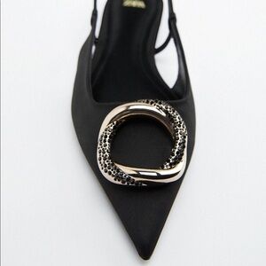 Flat slingback flats with metal detail on the front with rhinestones. Wraparound back strap around the ankle. Pointed toe.