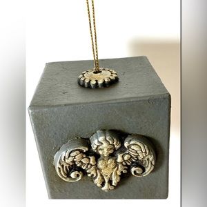 Measures 3" cube. Made of paper mache and clay and has a gold cord for hanging.