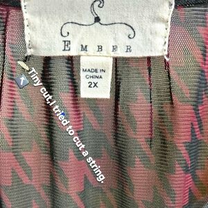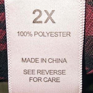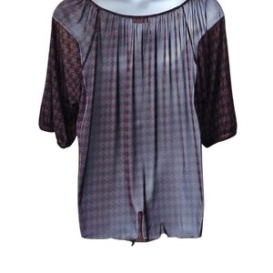 Blouse features a round neckline, sheer,see through material. Half sleeve, front button placket, tie front, burgundy and black houndstooth print blouse. Super lightweight, pull over head style, Plus Size 2x Material 100% Polyester Hand wash cold, Do not bleach, hang to dry, low iron if necessary. Imported!