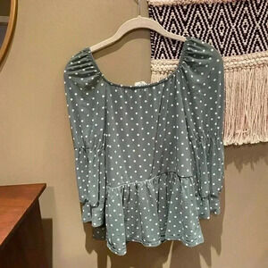 Size M. Ember sage green with white polka dots ruffle top. Cinched waist with gorgeous neckline. Excellent used condition! Reasonable offers welcome!