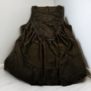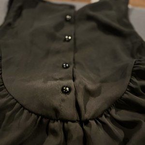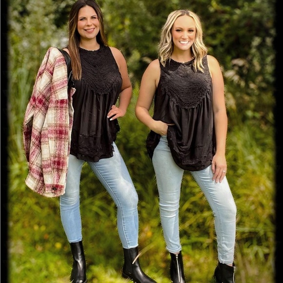 BEAUTIFUL OVERSIZED LACED RUFFLE BLACK SHELL. LACE FRONT WITH FRONT AND BACK RUFFLE LACE TRIM. BUTTON-UP BACK HI-LOW.