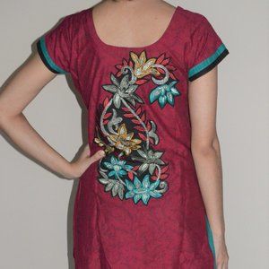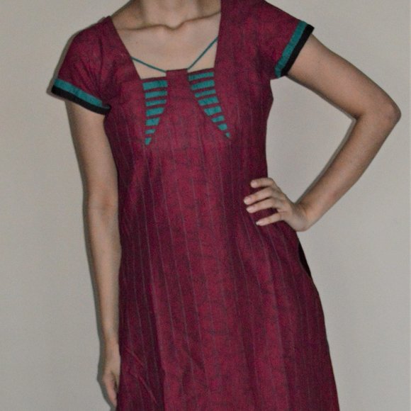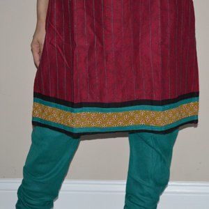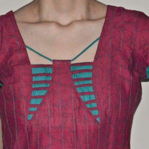 Lovely custom tailored salwar kameez with embroidery on back. Unique pattern neck design. No dupatta/Shawl available. Pair it with any contrasting shawl.