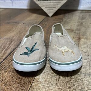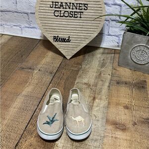 For everyday style with a twist, these slip-on sneakers with an embroidered camel design are always ready for adventure.
