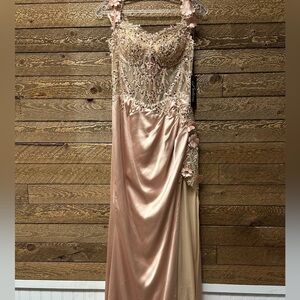 EMBROIDERED OFF SHOULDER CORSET SLIT GOWN BY ADORA 3132 in Champagne