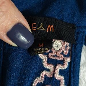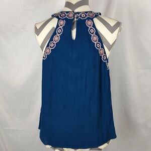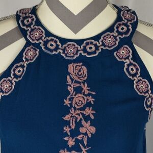 This EM blue and pink embroidered floral halter top is a junior size Medium with pit to pit measuring 20". It is beautifully embroidered with floral design. It has two button loop closure in back. Pre-owned and in excellent condition. All offers welcome.