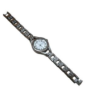 This elegant vintage timepiece features a sleek stainless steel construction with a distinctive chain-link bracelet design. The watch showcases a clean, dial with bold black Arabic numerals for easy readability and classic styling. The petite oval case offers a feminine silhouette while maintaining durability with its stainless steel back construction.