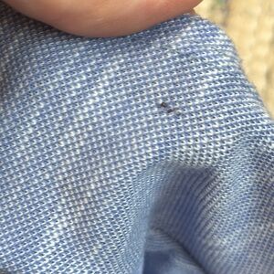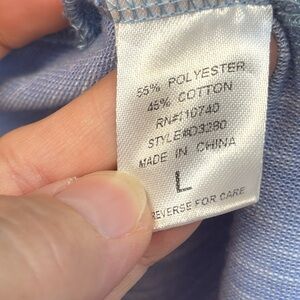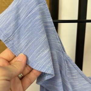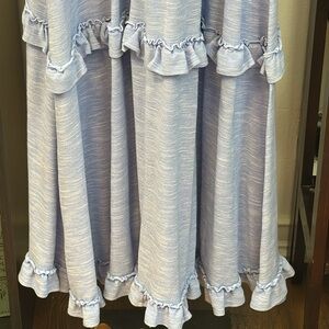 Blue and white Emelia dress, size large, ruffles and button detail, small hole under top ruffle near arm hole (please see photos).