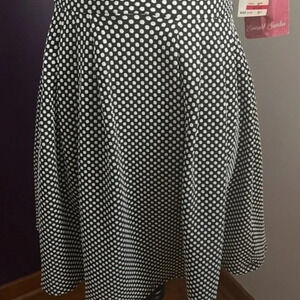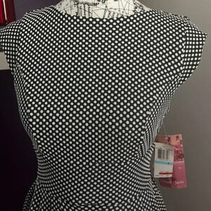 EMERALD Sundae Fit and Flare Dress. Size 5 (Jrs) Black and White - NWT.  Cap Sleeve and darted detail at bust. Dress is 92% polyester, 8% spandex. Lining from shoulders to waist is 100% polyester. Approx. measurements: pit to pit 16", shoulder to bottom hem 32", shoulder to shoulder across back 13", zipper on back 16".