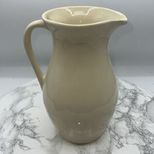 Beige pitcher with pink hyacinth, blue/yellow and purple Irises. Excellent condition. Measures 8”H x 4”W x 6”W at handle. Made in the USA, lead free!