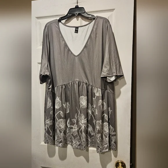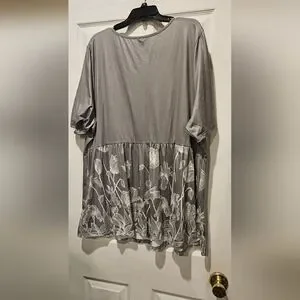 EMERY ROSE TOP GRAY WITH WHITE TULIPS DESIGN SIZE 5X 89% POLYESTER 26 INCHES PIT TO PIT 33 INCHES SHOULDER TO HEM