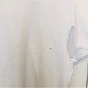 White Emma & Sam tee shirt w/ rose 🌹appliqué. Loose thread, see front, made a small hole. Small hole on back, see photo.