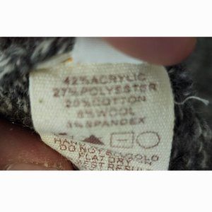 Made of Acrylic, Cotton, Wool and Poly. There is a little spandex in the material to give it some give. Very warm.. Perfect for the cabin, outdoor festivities or activities.