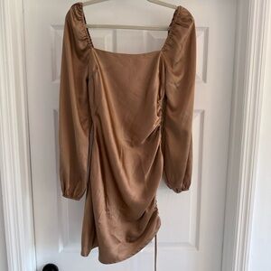 EMORY PARK Bronze Brown Satin Slinky Cinch Side Mini Dress Long Sleeve S