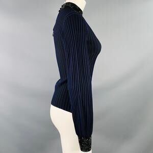 EMPORIO ARMANI dress top in a black and navy viscose blend fabric featuring a stripe pattern, long blouson sleeves with rhinestone embellished cuffs, and rhinestone embellished mock neck.