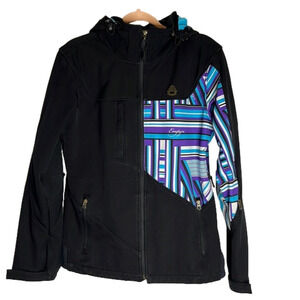 Empyre ski jacket , size large, waterproof rating 10,000 MM, black with purple, blue & white geometrical design, in good condition