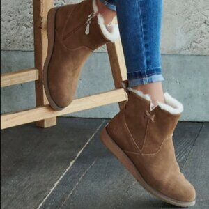 Stylish tan suede boots with cozy Merino wool lining. Perfect for cold weather and cozy warm. Side zipper for easy on and off. Excellent clean, barely worn condition. Stored in their original box.