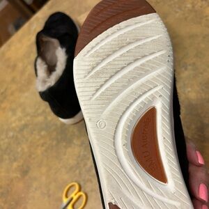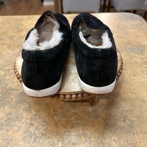 Experience comfort and style with these black fur-lined slip-on shoes. Perfect for casual outings, these shoes offer warmth and a sleek look. Made with high quality sheepskin. Size 9. Excellent condition