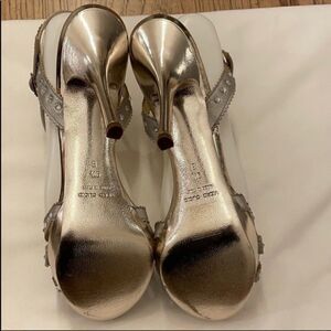 EMY MACK NEW 5 INCH STILETTO HEELS. BEAUTIFUL “DIAMOND” THROUGHOUT SILVER/PEWTER STRAPS. A CLASSIC T STRAP IN FRONT. VERY LIGHTWEIGHT SHOES WITH A SMALL PLATFORM IN THE FRONT OF THESE SANDALS. BEAUTIFUL DOUBLE STRAP AT THE BACK HEEL. SIZE IS 9.5. SHOES ARE NEW. THESE BEAUTIFUL HEELS GO WITH SO MUCH!! REGULAR PRICE $285. COLOR IS GUNMETAL SILVER