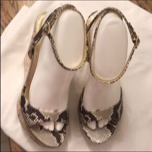 EMY MACK PYTHON PRINT WEDGE HEELS. LIGHTWEIGHT, NICELY PADDED. 5.5 INCH HEELS. WRAPS AROUND THE ANKLES. REGULAR PRICE $250. NEW. BOX HAS NO TOP.