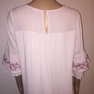 Blush pink color Boho tunic by EN CREME with beautiful burgundy embroidery on sleeves and neckline. Sleeves are 3/4/ and are ruffled. This could be worn as a dress as well. This is fully lined. 1 button closure in back. Size is Medium. Measurements are: pit to pit 20" sleeve is 19" length is 31" Really beautiful. EUC no flaws. Smoke free home. Reasonable offers welcome.
