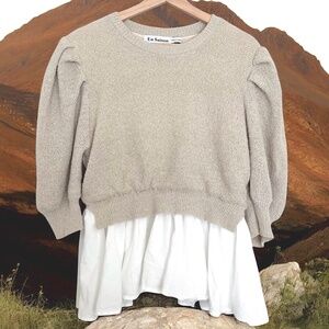 Elevate your everyday style with the EN SAISON Mixed Media Puff Sleeve Top in a chic natural hue. This effortlessly cool top blends a comfortable, fitted rib-knit bodice with dramatic, woven cotton puff sleeves for a modern, romantic vibe. The perfect statement piece, this top can be dressed up with a skirt and heels or down with your favorite denim and sneakers. Its versatile, on-trend silhouette makes it a must-have for any wardrobe!