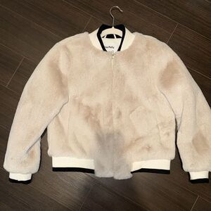 Stylish cream faux fur bomber jacket with black and white trim. Perfect for a chic look.