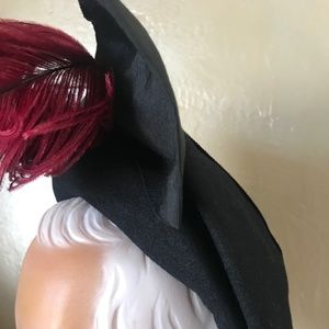 ENCHANTING 1940s' BLACK FELT BERET WITH BURGUNDY OSTRICH FEATHER + FABRIC BOW