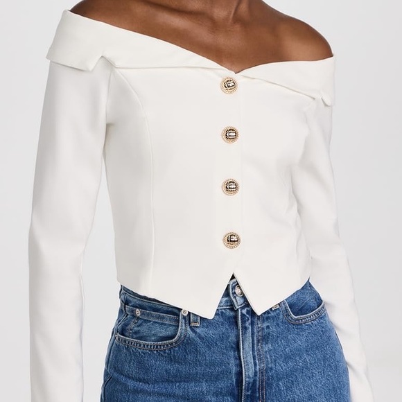Taking style cues from a polished blazer, this endless rose top is a creative way to show a little shoulder. Go for a cool half-dressy, half-casual look by pairing this piece with faded jeans and heeled sandals. Fabric: Mid-weight, super-stretch suiting, Off-shoulder neckline, Non-slip rubber binding, Gold-tone button placket, Long sleeves. In perfect condition, price is negotiable