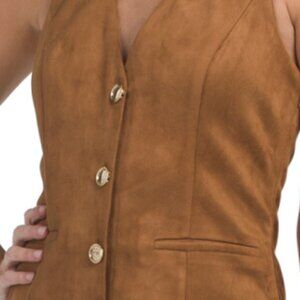 faux button front closure, gold tone hardware, 2 faux front pockets, faux suede finish, fabric provides stretch