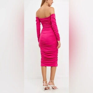 Our Off-The-Shoulder Ruched Midi Dress is the perfect dress to wear to date night, a party, or any other special occasion. The flattering ruching creates a fitted silhouette that shows off your curves, and the sleeves sit off your shoulders. When you wear this dress, you'll feel confident.