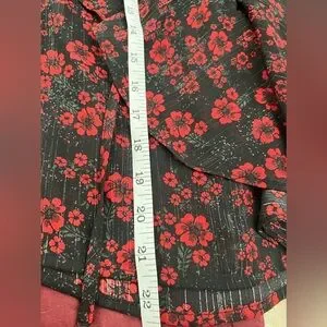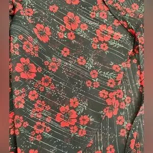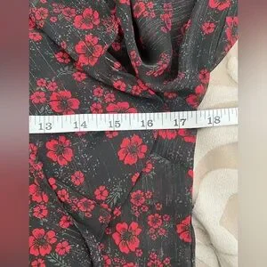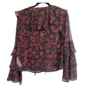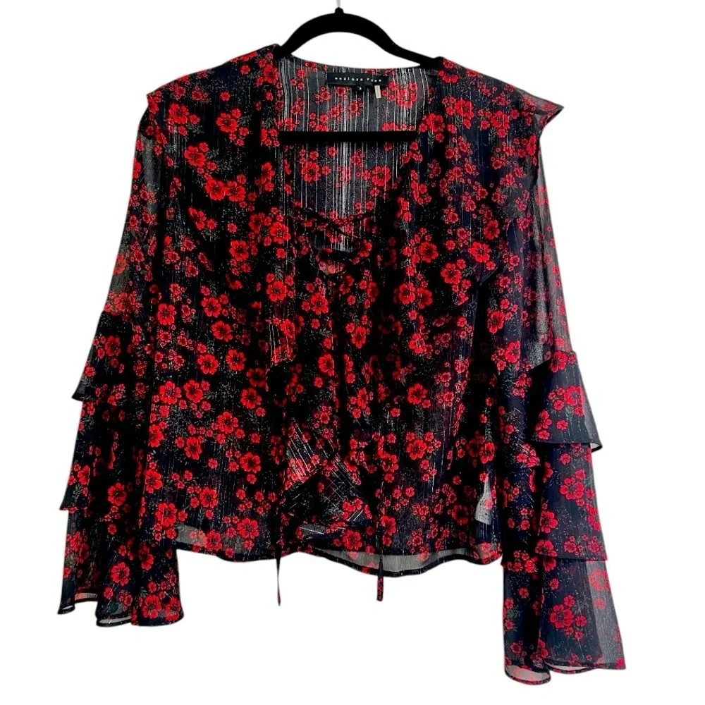Gorgeous semi sheer long sleeve black floral top with red flowers and silver threads running down the top which give it a shimmer. Three tiered ruffles to end of sleeves, ruffle collar, string tie to mid chest.