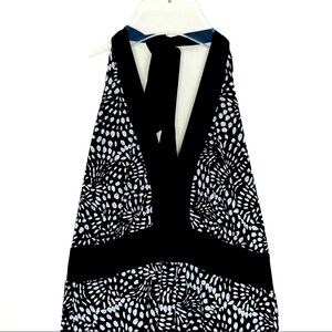 Black and White abstract pattern. Ties around neck. Dress has a bit of flare swing bat bottom.