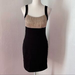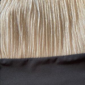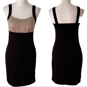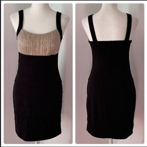 Looking for a New Year’s Cocktail/Party dress? Here’s one for you! In excellent pre-owned condition. Show off all that curves in this form fitting dress with shimmery gold top and black straps & big pleated skirt. Back is plain black. Pullover dress. Lightly Padded Bust