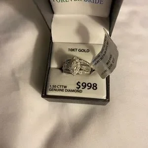 Engagement 1.50 carat triple band baguette in the middle 12 small diamonds surrounding 10 karat white gold