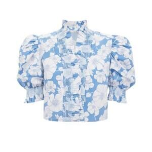 ENGLISH FACTORY Blue Floral Ruffle Neck Aria Blouse Size S NWT