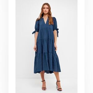 ENGLISH FACTORY Gingham Tiered Midi Dress with Bow Tie Sleeves in blue