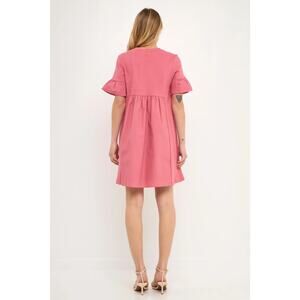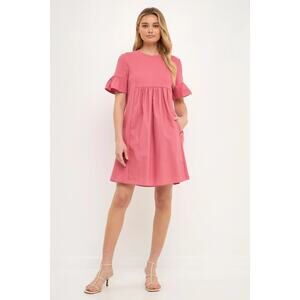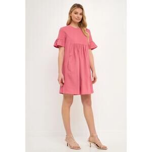 ENGLISH FACTORY MIXED MEDIA SHORT-SLEEVE MINI DRESS in Dusty Pink, Size Medium, Ruffle Sleeves, Crewneck, Pullover, Babydoll Silhouette, Excellent Condition with No Flaws or Signs of Wear.