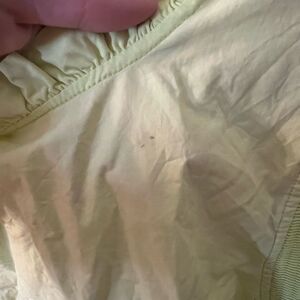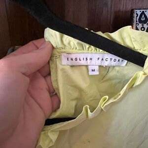 English factory x TUCKERNUCK mixed media ruffle shirt in butter yellow which is very light light lime green. Two super small detergent spots but otherwise great condition!
