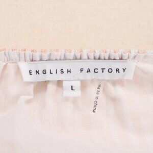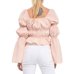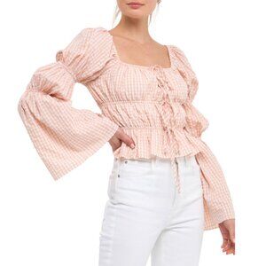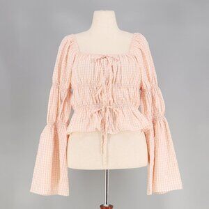 ENGLISH FACTORY Tie Detailed Gingham Shirring Top Long Sleeves Blush Pink Size L