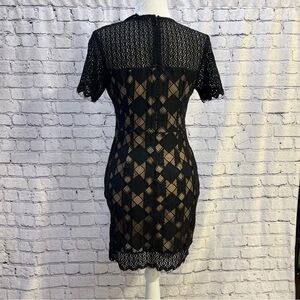 *Black Sheer neck and sleeves with lace design, sheer parts on the on body of dress as well with a with nude/beige lining.