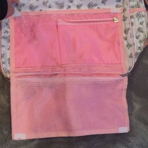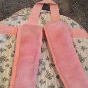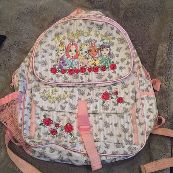 Beautiful English Roses which was inspired by Madonna's book. Beautifully made with Rose floral print. Has girls on the front and ER VIP club. Lots of compartments for storage and side holder for a water bottle. Front opens to reveal more space for extras and pencil case. Has a matching lunchbox never used as well. Minor flaws on bottom and a tear on the mesh. Can be sewed.