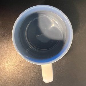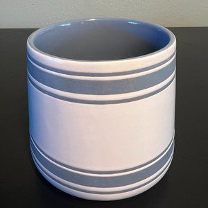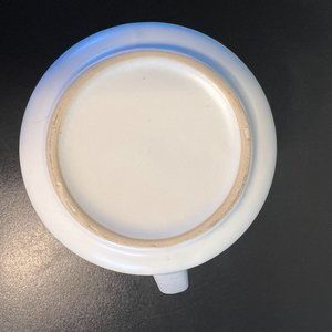 Decorative wide and narrow blue gray stripes circle the off white matte glazed exterior. Incised black text reads, ENJOY THE LITTLE THINGS. Beautiful blue gray smooth gloss interior.This durable stoneware mug has a nice heavy pottery feel to it and a comfortable handle. Measures 4” tall with a 3.5” diameter; 5” across including handle. Holds 18 fluid oz.